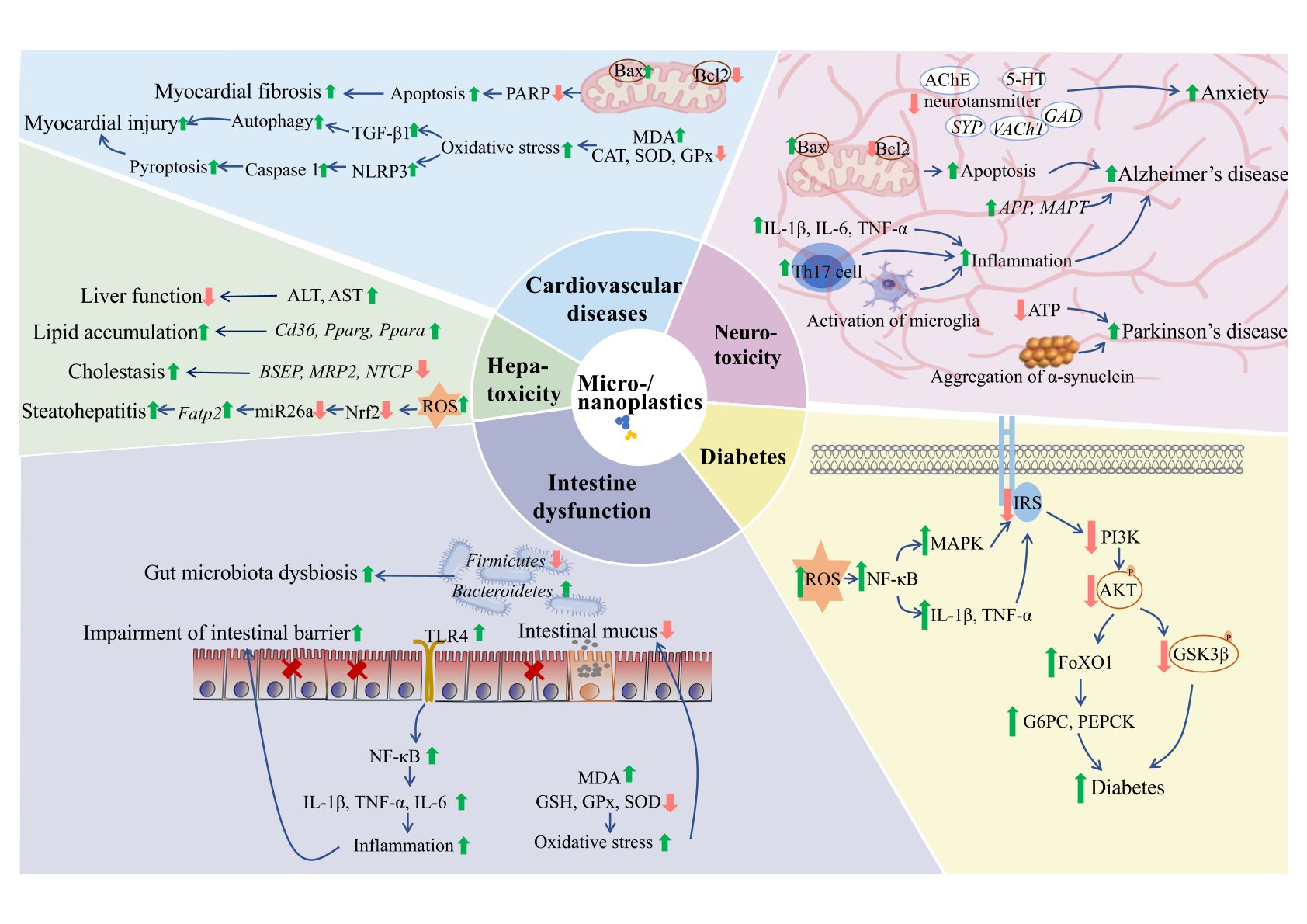 微塑料是目前多个学科的研究热点,起初的研究主要集中在对海洋生物和生态的影响。但近年来由于微塑料普遍在食物、饮用水和空气中检出,人类不可避免地暴露于微塑料和纳塑料,其对人类健康的危害被广泛关注。微塑料表现出神经毒性、致癌性、生殖毒性、发育毒性等,并且还会诱发肠道紊乱、心血管疾病等。另一方面,某些膳食天然产物能够预防和缓解微塑料对人的健康危害。