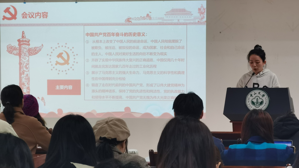 会上博士研究生应钰婷同学分享了学习《中国共产党第十九届中央委员会第六次全体会议公报》的心得体会,她讲述自己在英国留学的亲身见闻,对比了近年来我国和欧美国家的发展速度,使学员们对我国取得的历史成就和历史经验有了更加直观的认识,对中国共产党的人民性有了更深刻的理解,更加坚定“四个自信”,做到“两个维护”。