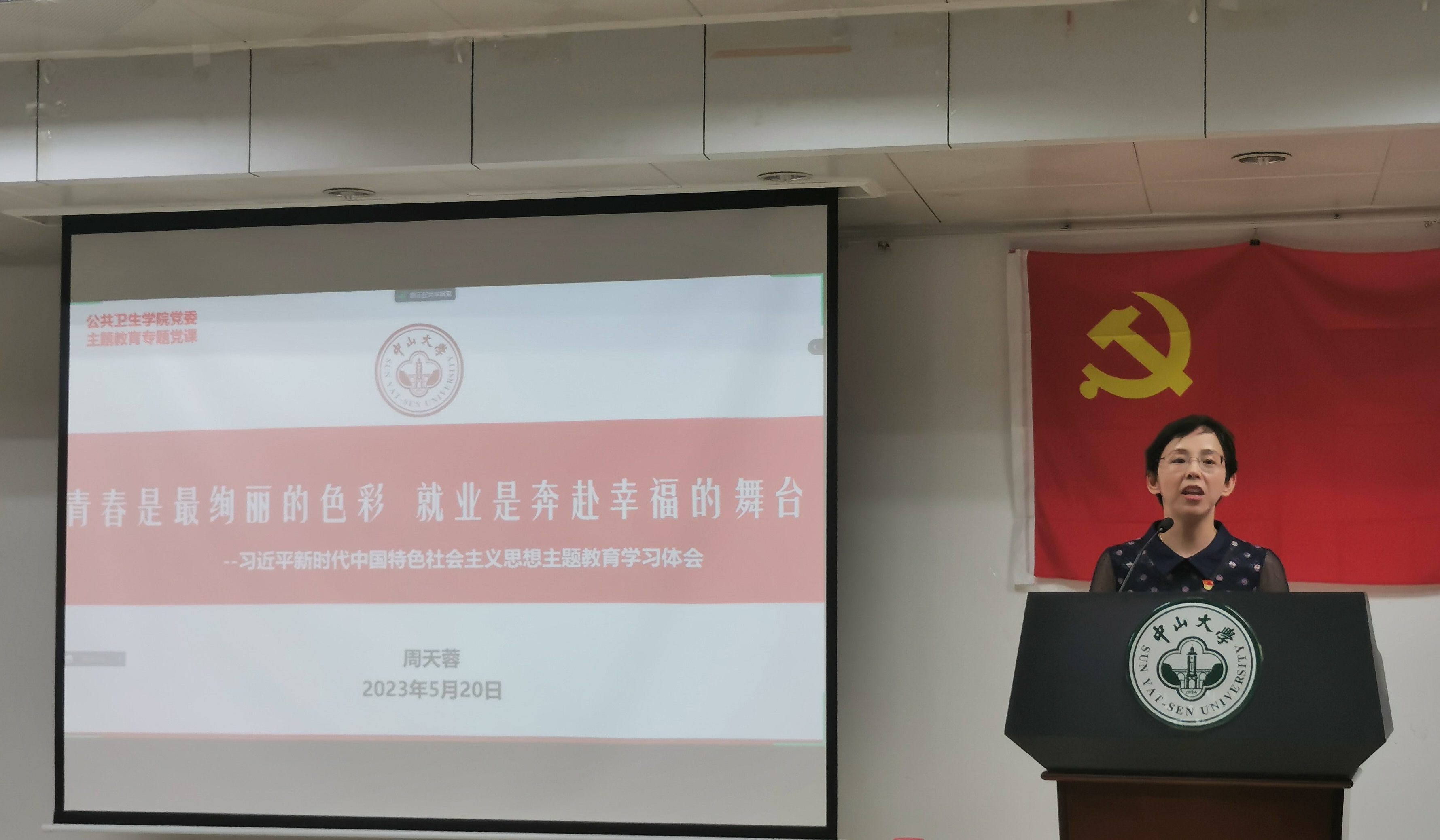 周天蓉老师以《青春是最绚丽的色彩,就业是奔赴幸福的舞台》为题,讲了主题教育专题党课。习近平总书记曾寄语青年人,要在艰苦奋斗中砥砺意志品质,在实践中增长工作本领。结合总书记的期望和教诲,周老师分享了自己的经验和体会:要永葆理想志向,立大志,做大事;要坚持学习积累,求真知,练真功;要善于协作共赢,汇同心,聚同力;要守底线,不逾矩,行于廉,止于欲。周老师鼓励党员同志们,做具有坚定理想信念、强烈家国情怀、高尚道德情操、扎实公卫学识根底、卓越实践能力的中大公卫的青年人。