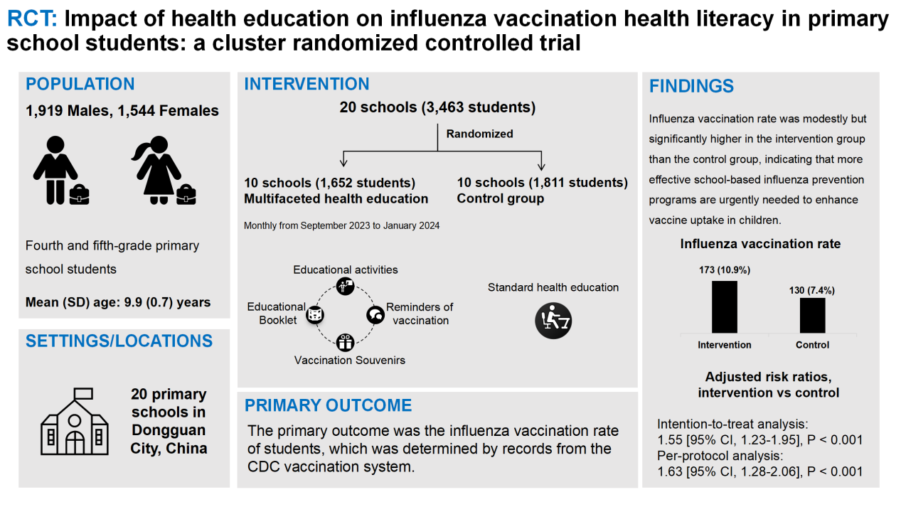流行性感冒(简称“流感”)仍然是全球范围内的重大公共卫生问题。在中国,儿童流感疾病负担显著,超90%的流感暴发疫情发生在学校等教育场所。尽管流感疫苗是预防流感最有效的手段,但我国儿童流感疫苗的接种率仍远低于世界卫生组织推荐的75%的目标。健康素养,即获取、理解和应用健康信息以做出明智健康决策的能力,与疫苗接种率的高低息息相关。尽管关于健康教育干预对疫苗接种率和健康素养影响的文献较多,但缺乏针对我国小学生群体的相关研究证据。为了解决这一问题,该研究通过整群随机对照试验,探讨了多维度健康教育对东莞小学生流感疫苗接种率及健康素养的影响。