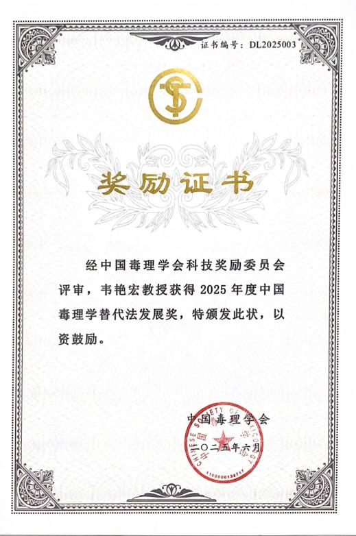 韦艳宏教授团队成果曾先后荣获2025年美国毒理学会心血管毒理最具影响力成果奖 “Impact Award” 以及2025年 “中国毒理学会替代法发展奖”。“中国毒理学会替代法发展奖” 是我国毒理学替代方法领域的权威奖项,旨在表彰在减少、优化和替代传统实验动物使用(即 “3R” 原则)方面取得突出原创成果的研究。凸显了此项研究获得了国内外学界的高度认可,充分彰显其前沿性与影响力。该项目成果推动了化学物心血管毒性评价方法的变革,在环境毒理、药物开发和公共卫生等领域呈现出广阔的应用前景。